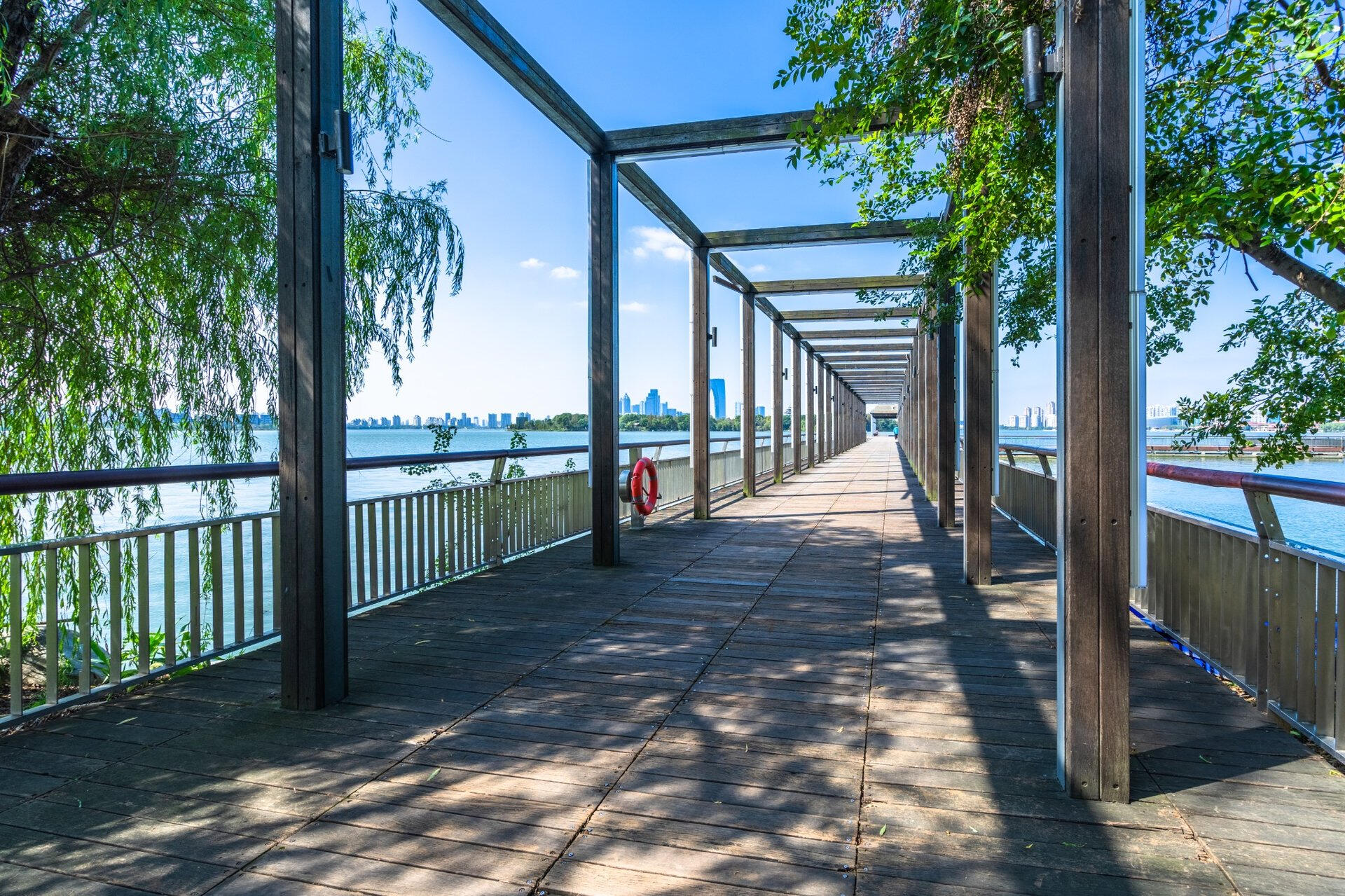 Bright architectural scene of a business district pedestrian bridgeChongyuan Temple, Suzhou - JaCZhou