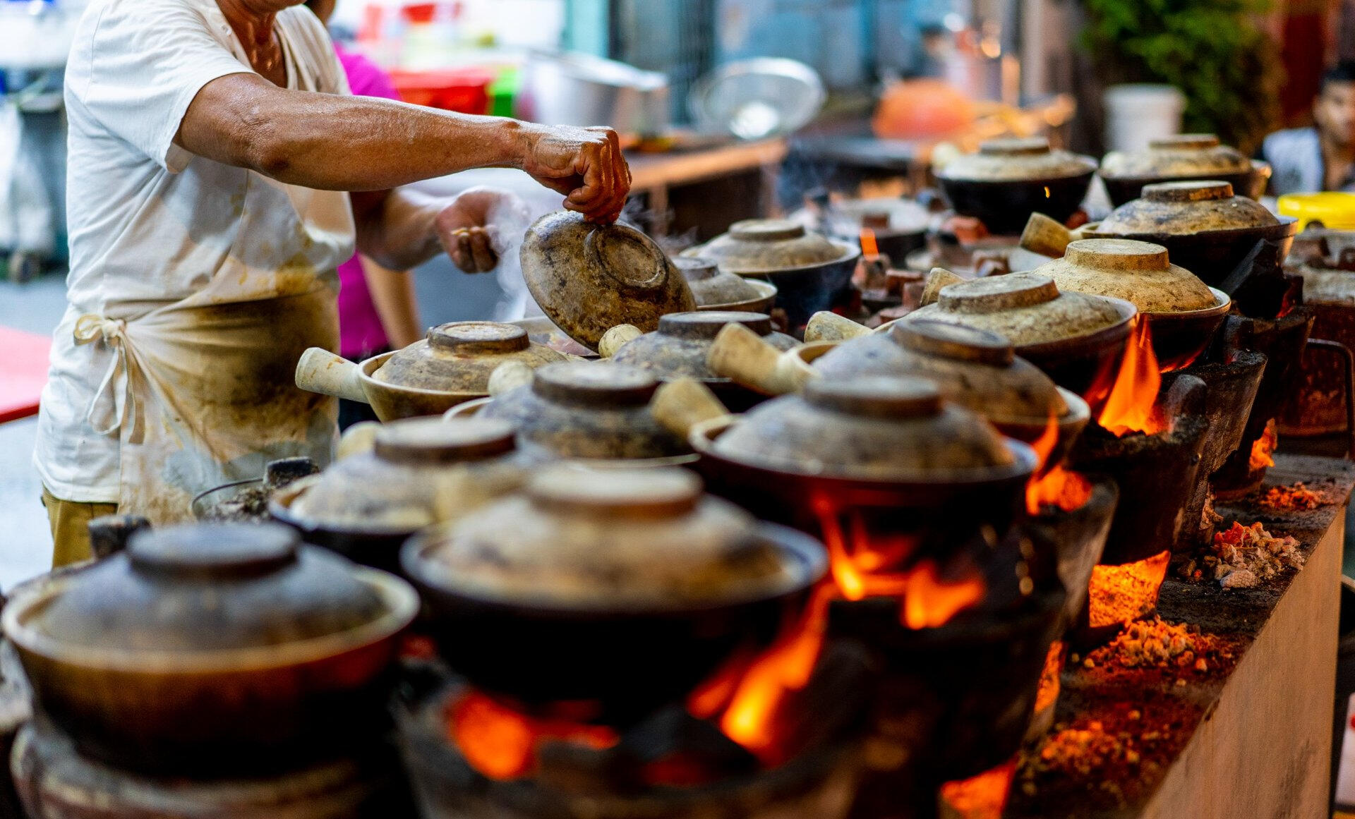 Street hawker cooking clay pot chicken rice in MalaysiaWalkway Bridge, Asia - hallohuahua